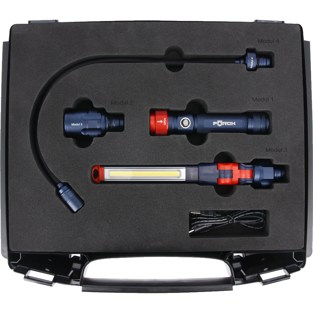 • sada pracovného LED svietidla 3 v 1 so spojovacím systémom pomocou jednoduchej aretácie, v pohodlnom prepravnom kufríku FÖRCH, ideálna pre mobilné použitie